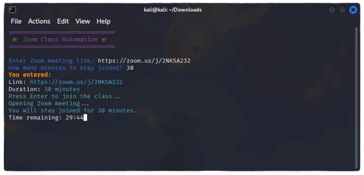 The "Zoom Class Automation" project is designed to streamline and automate the process of managing Zoom meetings, particularly for educational or recurring event contexts, through the integration of a Telegram bot. This innovative solution addresses the common challenges of manual scheduling, attendance tracking, and notification dissemination, offering a seamless and efficient way to handle virtual classes or meetings. The Telegram bot acts as an intuitive interface, allowing users to schedule Zoom meetings directly from their chat application, receive timely reminders, and even generate meeting links automatically. This automation significantly reduces administrative overhead, ensuring that participants are always informed and prepared for their sessions. The system is built to be robust and user-friendly, providing a reliable platform for both educators and students to engage in virtual learning environments without the hassle of manual coordination. It enhances productivity by minimizing the time spent on logistical tasks, thereby allowing users to focus more on the content and interaction of their Zoom sessions. This project exemplifies the power of integrating communication platforms with productivity tools to create a more connected and automated workflow.